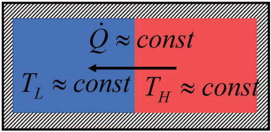 A schematic of an isolated system with two sub systems at equilibrium but at different temperatures so that heat flows from the hotter to the colder subsystem. The heat capacities of the two subsystems are assumed to be infinite so that the temperatures remain fairly constant, their difference therefore driving a fairly constant heat flux. This corresponds to a near equilibrium interaction for each system (linear non-equilibrium), so that the internal energy of each subsystem increases linearly with time.