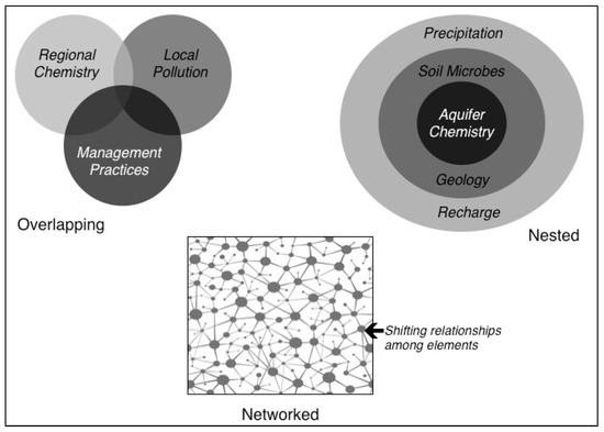 Systems theory describes the interactions among water system elements as spatiotemporal relationships, or patterns. Whereas matter and energy are cycled through a system, the focus is on describing a system’s organization and interactions, thus permitting the identification of controls, hierarchies, and feedback dynamics that govern its trajectory and observable behavior. Evaluating the connectivity of water quality parameters as a coherent network, rather than as isolated data points, has been used to expose data limitations and changing relationships among the system’s elements that influence water quality. Systems approaches have also been applied to setting water quality standards, selecting variables to assess nonlinearity and spatiotemporal variability, and optimizing community-based programs designed to monitor water quality [6,7].