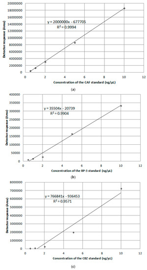 Calibration curve by GC-MS for (a) CAF; (b) BP-3; (c) CBZ.