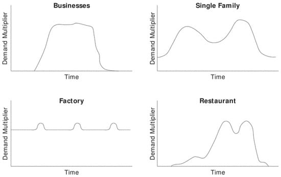Water consumption patterns vary from each other, depending on the type of customer. There are four basic types of recipients: domestic, industry (e.g., factory), business and service (e.g., restaurant). Domestic and service areas are characterized by two maximum water demands per day, for domestic these are morning and evening, and for services there are two in the evening. Industry water consumption patterns are determined by the nature of the customers’ work—the maximum water demand may occur in the afternoon or at night—while for businesses, it is characterized by an equal water intake throughout the day (Figure 1).