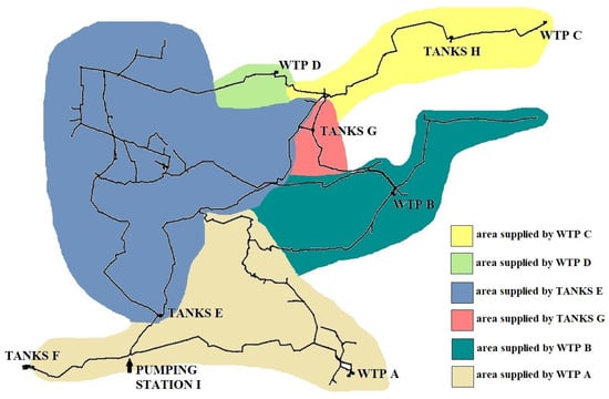 The subject of this study is the selected water supply area of the large WDS. The subsystem consists of four Water Treatment Plants (WTP A, WTP B, WTP C and WTP D) with a total daily average production of 55,000 m3 and four complexes of tanks (TANKS E, F, G and H) with a total capacity of 162,000 m3 (Figure 2). Tanks E are additionally supplied from a pumping station (PUMPING STATION I) located outside the considered area of subsystem, with an average daily amount of 60,000 m3. The average daily amount of supplied water in this area is 115,000 m3. Daily water demand for this area is 102,000 m3. The WDS under consideration is a wide network with a total length of 256 km. The water supply infrastructure is characterized by high variability of material and diameters from 55 mm to 1600 mm. The WDS is mainly made of steel (73%) and polyethylene PE-SDR17 (10.6%), with a small share of ductile iron. The oldest pipelines comprising this distribution subsystem date back to 1929 (steel wires), and the most recentto2016 (PE-SDR17).