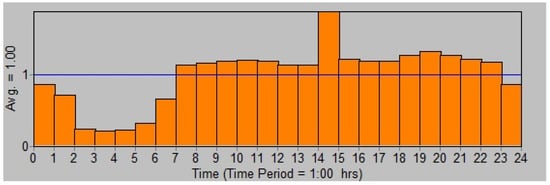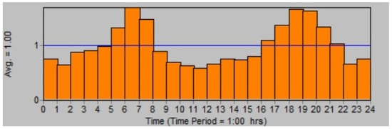 Water demand is related to water consumption patterns and the placement of consumption points []. Data used to create hydraulic models are mostly based on the GIS (Geographic Information System) database, billing databases, and SCADA (Supervisory Control and Data Acquisition) systems. The location points of customers are obtained from the first database, which assigns water demand to the nearest node. While water demand (average, maximal or minimal value) and water consumption patterns are exported from the two other databases. According to the modeling algorithm, the water consumption pattern is determined by formula below []:
