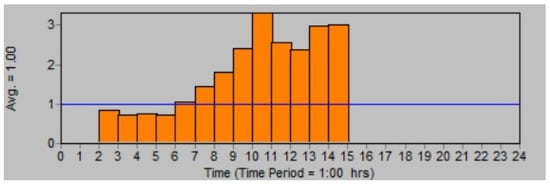 Industrial consumers often collect water irregularly or periodically, contributing to the maintenance of high network pressures around the clock at 75–100 m H2O. Figure 4 and Figure 5 show exemplary water consumption patterns for industry, showing irregular water consumption. Figure 4 shows a customer receiving water for 13 h, and Figure 5 shows a customer characterized by a certain regularity of water intake from morning to night.