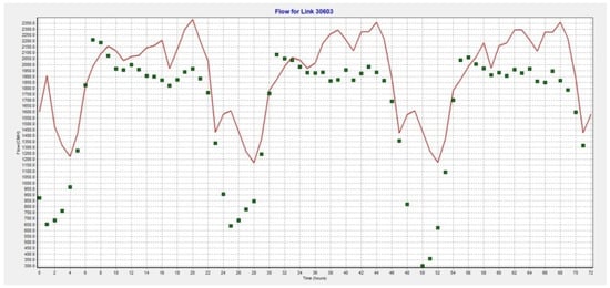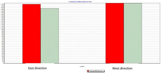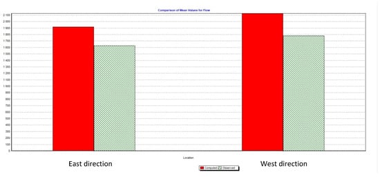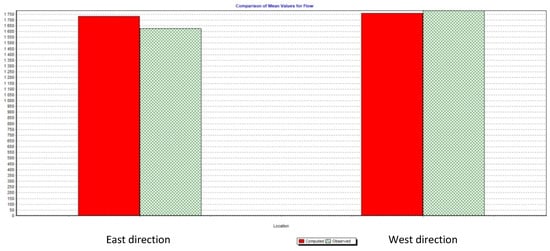 Due to the size of the supplying area, a detailed analysis was conducted for Tanks E (Figure 1, color blue). Figure 6, Figure 7, Figure 8, Figure 9, Figure 10 and Figure 11 show simulation results for two flows from Tanks E—west and east directions.
