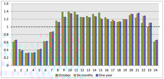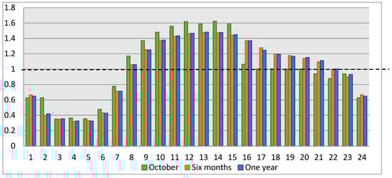 Such results may be due to various events occurring in the given periods, which could have influenced the quality of the data. The one-month period may seem appropriate because there are no seasonal fluctuations, but data from this period would be very sensitive to disturbances. In October, in this area, there were several pipe failures and several devices failures, which affected the data. In the six-month and one-year periods, there were dozens of such failures, but these distortions were “lost” in the correct data. On the other hand, the nodal demand values were calculated over the entire period, which contained seasonal fluctuations. This means that the average value could be overestimated or underestimated. The figures below show daily water consumption patterns for selected water intake points from the area supplied by Tanks E. Figure 15 shows the variability of the water consumption pattern, depending on the time period, for the domestic area, and Figure 16 for the industrial area. The graphs show that the longer the period from which the patterns were created, the closer the hourly demand values were to the daily average demand value (line = 1), meaning that they are more stable.