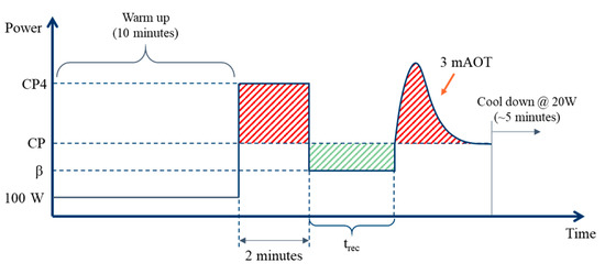 The proposed protocol also serves as a reliability test for CP determined from the 3mAOT. Ideally, the average power of the last 30 s in the 3-min all-out exertion interval of the intermittent cycling protocol should be equal to the individual’s CP. The profile in Figure 2 is similar to a response surface with recovery power and recovery time as inputs. This surface would result in a specific amount of AWC recovered for a combination of β and trec. The response surface, once generated, can be used in an optimal control system to monitor and optimize performance in real time.