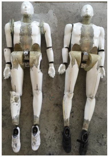 The two pedaling models are shown in Figure 1. The height was adjusted to 1.62 m, which was defined as the height of Japanese Paralympians. Commercially available mannequins made of fiber-reinforced plastic were used for the riders. In order that the joints at the neck, shoulders, elbows, wrists, waist, knees and ankles could move, cuts were made at the joints and mechanisms inserted. It should be noted that these mannequins did not have any active mechanism to make them move. Movement of the mannequins was forced through the pedal by the motor shown in Figure 2b.