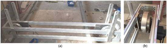 The frame for supporting the tandem bike and the two pedaling models in the wind tunnel is shown in Figure 2. The side view is in Figure 2a, while a magnified picture around the pulley and motor for the front wheel is shown in Figure 2b. The left pulley in Figure 2a is for the front wheel, while the right pulley is for the rear wheel. The wheels were rotated via the pulleys by motors. The struts have a NACA0012 airfoil cross section. Since the distance between both struts is adjustable, this frame is usable for a normal (single) bike.