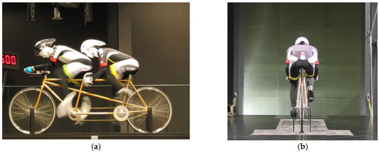 Wind tunnel tests were carried out in the Japan Institute of Sports Science as shown in Figure 3. A commercially available tandem bike was employed (Panasonic). The wind tunnel is an Eiffel type, and the size of the outlet is 2.5 m by 3.0 m. The wind direction is from the left to the right. As can be seen from the side view, both the pilot and the stoker are pedaling. The drag was measured with a six-component balance (LMC-61263, Nissho electric).