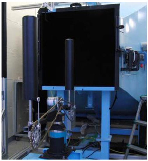 Both cylinders are connected to the motor via gears and chains, so that they oscillate at the same frequency. Since there were 36 gears on the sprocket, it was possible to acquire the data with phase difference intervals of 10 degrees. In this case, the data were acquired with a phase difference interval of 30 degrees. The diameters of both cylinders were 80 mm, the distance between them was 800 mm, the amplitude of the oscillation was 100 mm, and the wind speed was set at 14 m/s (50 km/h).
