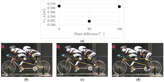 The dependence of the phase difference between the crank angle of the pilot and that of the stoker on the CDA is shown in Figure 5. The CDA is the drag divided by the dynamic pressure. The drag is the averaged values for 8 cycles (about 5 s) with a sampling rate of 1 KHz. Therefore, it was independent of the start or end positions of legs. Although the repeatability of the raw oscillating data was good, the measuring time should be longer in the future. Figure 5b–d are snapshots during the run.