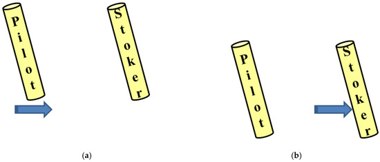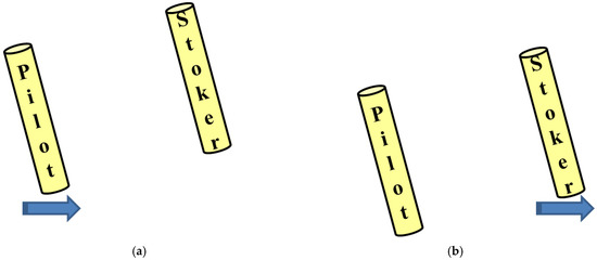 Schematics illustrating the flow around both legs at 90 degrees (Figure 5c). The wind direction is from the left to the right. (a) the stoker’s leg is at the top (the pilot’s leg is in front); (b) the pilot’s leg is at the bottom.