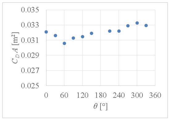 In order to examine the flow images shown in Figure 6 and Figure 7, the drag acting on the two oscillating cylinders shown in Figure 4 was measured at a wind speed of 14 m/s. The results are shown in Figure 8. The ordinate is CDA, which is the drag divided by the dynamic pressure, while the abscissa, θ, is the phase difference between the cylinders. For example, a phase difference of 0 degrees means that both cylinders oscillate synchronously, while a phase difference of 90 degrees means that the cylinder on the downstream side is delayed by 90 degrees. At 330 degrees, the cylinder on the downstream side leads by 30 degrees. It was found that the drag depends on the phase difference. It can be seen that CDA decreases with increasing θ up to 60 degrees, and then increases with increasing θ. The values at more than 180 degrees are larger than the value at 0 degrees. Therefore, it can be concluded that the drag decreases when the cylinder on the downstream side is delayed, while it increases when the cylinder on the downstream side leads. In other words, the drag decreases when stoker’s crank angle is delayed to the pilot’s crank angle.