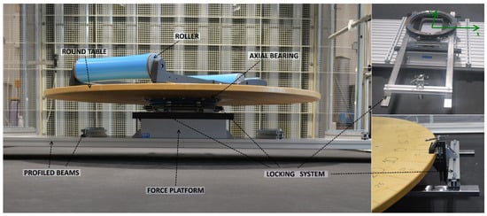 To analyse the cyclist’s interaction with the wind, the time-averaged aerodynamic force measurements technique has been chosen. A structure has been developed to investigate different angles of the wind (Figure 1). It is composed of a fixed part, lifted from the belt to allow its movement in order to have less flow diversion. This is possible with a flat surface of profiled beams linked to the base of the wind tunnel. A Kistler multicomponent force platform, recommended for measuring dynamic (type 9281EA, 1.25 kN of range in the horizontal plane, 1000 Hz of natural frequency and ±0.2% of linearity), lies in an upside-down position in the middle of this flat surface and it is stabilized from any movement and overturning. The mounting frame of the platform fixes the moving part of the system to the platform itself. An axial bearing is linked to the frame of the platform with bolts and it allows the rotation of a round wooden table. A set of yaw angles can be investigated by rotating the table and using a vice system to lock the position. Made of beams connected to the force platform, the locking system ends with a vice positioned on the rear part of the structure. Over the table, a commercial roller has been positioned, on which the cyclist can pedal with a total height between wheels and belt of 340 mm.