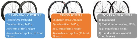 The experiment compares three 28” wheelsets (Figure 2), differing in material, weight, height of the rim, shape and number of spokes, as expressed in Figure 2. An experienced cyclist pedalled in the tunnel with the three wheelsets keeping the following parameters constant: racing bicycle (Wilier Izoard XP model), body position (dropped position with straight arms, facing forward), garments, speed on the rollers, cadence, tires and pressure, wind speed and procedure of the experiments.