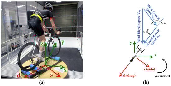 Figure 3. Reference coordinate systems (a) in a back-side view during a test and (b) in a sketch from a top view with the speed vectors. x, y, z is the absolute coordinate system of the platform, whilst the drag and side axes (d, s) rotate around z-axis (with the variation of the yaw angle ß) and they are referred to the rider. The angle γ is the absolute angle of the wind referred to the direction of motion. The controlled parameters during the tests were: the wind speed of the tunnel VWB and the yaw angle ß. - from the highest speed, wind is decreased to 0 km/h and when the fan stops completely (it needs around 25 s), the cyclist continues his pedalling for 30 s. During the data analysis, this phase has been used to consider the drift effect of the force platform during each test, in theory < ±10 mN/s;