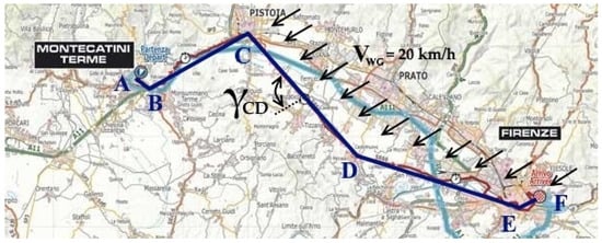A further analysis was to consider a real track and to compare the wheelsets through the time needed to complete it with constant pace. Instead of the simple straight itinerary, a more complex way was considered as an example: the flat route of the 2013 UCI road world championship elite men’s TTT (team time trial) from Montecatini Terme to Florence. The route map (Figure 4) can be simplified into five straight segments (AB, BC, CD, DE, EF) with 57 km of total length. After supposing a wind speed VWG of 20 km/h directed as in the figure, parallel to BC and EF, the cyclist was assumed to ride alone, with the tested bicycle and wheelsets, at a steady pace of 30 km/h.