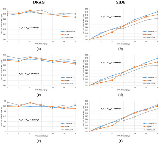 (a,c) Drag and (b,d) side effective frontal areas of the three wheelsets varying the yaw angle ß (by 5° increments) with a constant wind speed referred to the bicycle VWB of 40 km/h and 50 km/h; (e) drag and (f) side effective frontal areas of the three wheelsets varying the yaw angle ß (5° increments) with a constant wind speed referred to the ground VWG of 20 km/h.