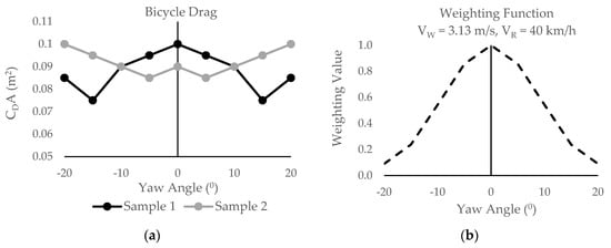 Aerodynamics has been well established as being critical to cycling performance. The validated power model for cycling described by Martin et al. [1] has shown that aerodynamics is the dominant form of resistance on a cyclist at speeds above 15 km/h, using typical values. At racing speeds of 45 km/h aerodynamics can comprise 80–90% of the total power required of an athlete [1,2]. For ground vehicles, aerodynamic performance is also dependent on the environmental wind conditions, which combine with road speed to create an angle of incidence between the bicycle’s direction of travel and the resultant wind vector; termed the yaw angle (Figure 1). As vehicle drag varies with yaw angle, an understanding of potential operating wind conditions is important for predicting and modelling performance.