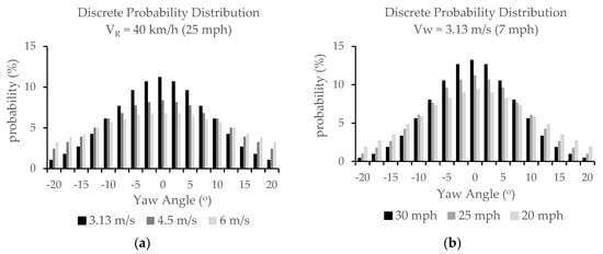 (a) Probability of yaw angle with varying road speed (VR); (b) Probability of yaw angle with varying mean wind speed (VW).