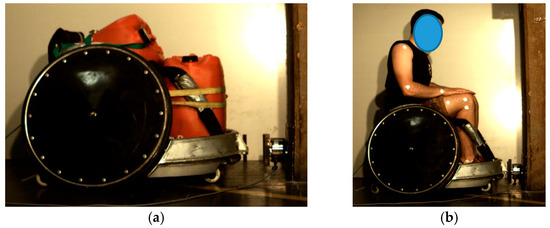 First, the calibration of the load cell was conducted, using a MTS hydraulic cylinder. Subsequently, it was fixed on a rigid wall, at the same height of the wheelchair’s frontal bumper and a steel plate (200 × 200 mm, 20 mm thickness) was screwed on it, in order to create a larger impact area. The test consisted in the wheelchair pushed perpendicularly against the load cell from three different distances, 1, 2 and 3 m. Two different configurations were tested: one with two tanks full of water of 94 kg weight fixed on the wheelchair and another with a person of 75 kg weight sitting on it, as shown in