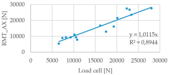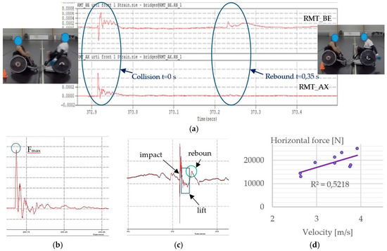 For each impact, the maximum values of the force acquired by the load cell and the horizontal force obtained by the wheelchair RMT_AX bridge were extracted. These values were compared in order to verify the validity of the measurements made by the strain gauge bridge on the wheelchair. In