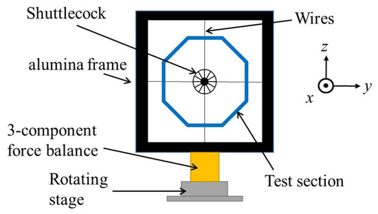 Figure 1 shows the experimental setup to measure the forces acting on a shuttlecock. The shuttlecock was supported at the center of the test section of the cork by two horizontally and vertically arranged thin wires with a diameter of 0.5 mm. These wires were attached to an aluminum frame surrounding the test section. The tension of the wires was controlled by screws positioned at the end of the wire. The frame was attached to a three-component balance (LMC-3501-50N, Nissho Electric Co., Ltd., Tokyo, Japan). The setup was similar to the experimental setup for measuring the negative Magnus force on a sphere, conducted by Konishi et al. [