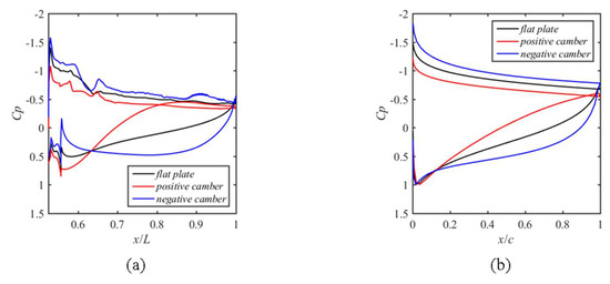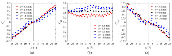 Figure 4a–c show the lift, drag, and pitching moment coefficient against the angle of attack, respectively. For the base model (i.e., with the camber set to zero), the trend of each coefficient value is almost the same as the results from other experimental studies, such as Cooke [