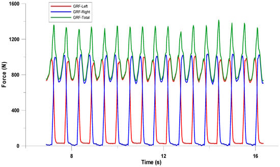Forces of both left and right foot with respect to time during medium speed walking, together with the summed forces of both feet (GRF = Ground Reaction Force).
