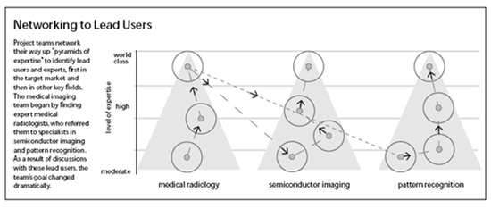 Pyramid networking as a method of identifying lead users through networking [1,16]. The pyramid method involves contacting users within a given market and questioning them on who they regard as a leader in the field or more knowledgeable on a subject than they are. This person is then contacted and the same questions asked until a lead user with a high level of subject experience and knowledge is found. An example is shown in Figure 1 below [2]. Medical imaging lead users were being wanted for information input into the development of a new medical imaging product. Pyramiding not only allowed identification of lead users but, these high-level users can often recommend users in other fields or knowledge areas that may also be beneficial to the product developer. The figure below depicts the process with lead users at the top of their knowledge area pyramid.