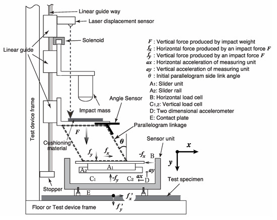 Figure 1 shows the structure of the 2-D impact test device. An impact force F is produced by dropping an impact mass onto the upper edge of a parallelogram linkage. The parallelogram linkage, represented by a dashed line in Figure 1, divides force F into a horizontal force and a vertical force, and transduces these forces to the sensor unit through the slider unit (A1, A2) without angular momentum. The parallelogram linkage is rigid, so that it always keeps the sensor unit in a horizontal position, even while the upper edge of the parallelogram linkage descends along the vertical linear guideway attached to the frame. That the force data from vertical load cells (C1 and C2) show almost the same time-series data supports this assertion. The initial angle θ controls the ratio of fx/fy. To calculate the forces applied to a specimen, f’x and f’y, a multiple of the sensor unit mass (0.8262 kg) and the relevant directional acceleration are subtracted from the measured forces fx and fy. Part D is a 2-D accelerometer. Horizontal and vertical velocity and displacement are calculated from acceleration by integration. Initial angle θ and drop height are measured by an angular sensor and laser displacement sensor, respectively. Impact mass is 6.5 kg, held and released by an electromagnet system to produce certain height drops.