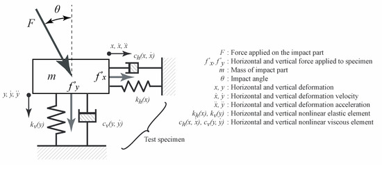 In Equation (1), m is the mass of the impact part, fx is the horizontal force applied to the specimen, fhk is the force generated by the nonlinear horizontal elastic element and fhc is the force generated by the nonlinear horizontal viscous element. Equation (2) shows the reaction force generated by the horizontal elastic force. In this study, angle θ and angular parameter αh, βh were incorporated into the model to represent the reaction force with the changing the impact angle. The vertical force fy was represented in a same manner, with all the parameters for the vertical element represented by the subscript ‘v’ instead of ‘h’.