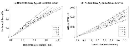 Impact force, deformation velocity, and deformation time series data were acquired from 2-D impact tests with 5 different initial angles and 7 different drop heights. In each impact test, the deformation and the force pair where were extracted to calculate the elastic fhk parameters. According to Equation (1), the impact force fx is equal to fhk if the impact velocity is zero (. The parameters in Equation (2) were calculated by the least squares method if the parameter αh, βh was given. To identify the parameter set, the combination of αh and βh that showing the minimum error between the experimental and estimated fhk were searched as a first step. Figure 3a shows the horizontal deformation—force fhk pair with the marker and the estimation curves. Each initial angle has a unique marker and line type, as indicated in the legend. As shown in Figure 3a, most fhk were on their own estimated lines, indicating that fhk were represented by a set of horizontal parameters and initial angle parameter θ. Figure 3b shows those of vertical elements, and that fvk can also be estimated with a vertical parameter set and initial angle parameter θ. After calculating the set of horizontal parameters, fx–fhk in every moment were calculated as fhc, and the parameters of fhc in Equation (3) were calculated by the least squares method. The vertical parameters fvc were calculated in this manner as well.