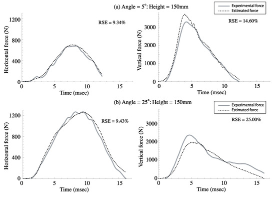 Table 1 presents the MRSE of each initial angle in both directions and the total average of MRSE. Figure 4 shows a comparison of the maximum intensity of the experimental force and estimated force at: (a) 5-degrees of initial angle and 150-mm drop height; and (b) 25-degrees initial angle and 150-mm drop height. In the figure, solid lines show the experimental force and dashed lines the estimated force calculated from the identified parameter set; the left sub-panel of each figure shows the horizontal force and the right sub-panel shows the vertical force.