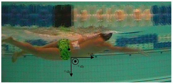 The IMU was taped to the swimmers lower back, as close as possible to the athlete’s costume, where the tether was connected to the swimmer (Figure 1). The anterior-posterior direction is represented by az, the mediolateral direction by ax, and the most interesting forward direction by ay.