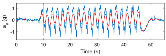 Figure 2 presents the recorded forward acceleration (ay in blue) and the gravity components in the signal (red) which have been removed from the acceleration data before further processing was conducted. The gravity corrected data were then fed into the zero-crossing detection algorithm to separate the left and right arm strokes. Figure 3 presents the results of the zero-crossing algorithm applied to the mediolateral acceleration data which basically represents the body-roll of the swimmer.