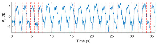 Mediolateral acceleration (gravity corrected, blue) with the overlapping zero-crossing detection result (red).