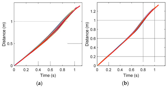 Individual stroke distances with the pattern overlapped (red): (a) left arm; (b) right arm.