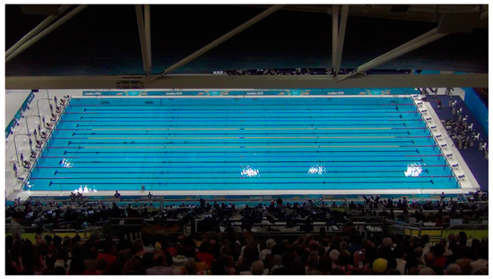 Video footage was collected (with permission from British Swimming) at the 2012 Olympic Games using a Sony HDR-PJ260VE camera (1920 × 1080 pixels, 50 Hz, progressive scan). The camera was mounted at the highest point in the temporary seating stand of the London Aquatics Centre. The optical axis was approximately perpendicular to the swimming direction, 25 m along the long axis of the pool (Figure 1). The .MTS video files were converted to .PNG images using Avisynth and VirtualDub. MATLAB® (2012a), image processing and statistics toolboxes were used for the analysis. Footage of a women’s 200 m medley race was used for algorithm development and validation of the proposed system.