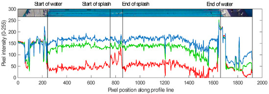 Visually, a distinct peak of increased RGBr values was seen around the region of splash, but due to the unstable water surface, the signal contained a high level of noise that triggered false positives. A filtering stage was used to improve the likelihood of correct detection. The values from all five profile lines were sorted into ascending order and a threshold value was assigned at the 98th percentile. Each profile line was filtered and RGBr values below the threshold were set to zero. The mean of the filtered profile lines was calculated and the values sorted into ascending order. The 50th percentile was selected as a second threshold. Further filtering with the second threshold returned a group of values along the profile line, the position of which corresponded to the start and end of the splash. The position of both the first and last values from the filtered group were important due to the change in direction of the swimmer at each lap. Swimming left to right (with respect to camera view), the last value detected was the most reliable signal (relating to splash from arms) with the first value detected (foot splash) showing high variations in location. When the swimmer changed direction (right to left), the first value became the leading splash (from arms) and the more stable signal for tracking. The signal exported for further analysis contained three values: (1) pixel position along ROI relating to the first detected value and (2) last detected value; and (3) the magnitude of the RGBr value.