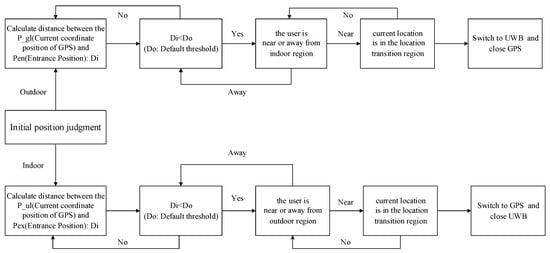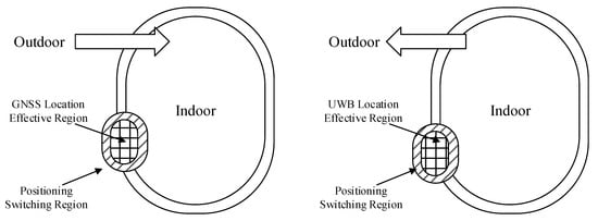 In the location transition region, both of the outdoor and indoor positioning system are available. The adaptive positioning switching mode is to switch the outdoor and indoor positioning methods in the location transition region, as shown in Figure 3.