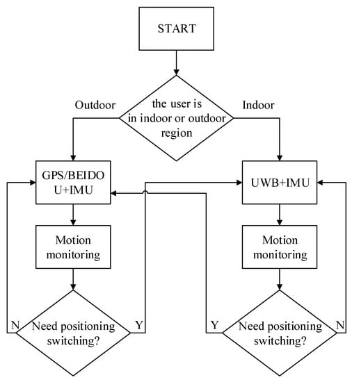 The proposed method uses GPS/BEIDOU with IMU-MEMS technology and UWB with IMU-MEMS technology for indoor and outdoor positioning. The architecture of the system is shown in Figure 5.