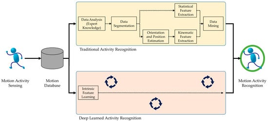 12]. The common flow of those steps can be summarized as (1) basic data analysis, (2) data segmentation into activity segments, (3) extraction of meaningful feature representations per data segment and (4) the retrieval of relevant motion information using similarity or variance measures and machine learning. Implementation of those major processing steps is subject to manual, hand-crafted algorithms and data transformations that depend on the specific characteristics of the given application. Consequently, it can be cumbersome to determine those data properties that work best for a given task, and often specific domain knowledge is necessary to ensure meaningful data processing. Common feature extractors range from simple statistical or spectral descriptions as obtained using Wavelet and Fourier transformations to kinematic-induced features such as body pose and body joint position [
