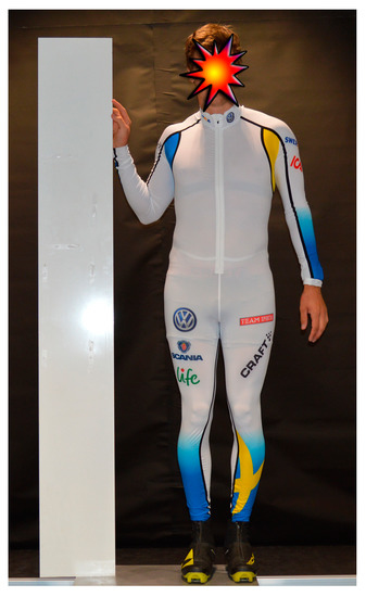 The experiments were carried out with the skier imitating postures during different phases of a few xc-skiing techniques while standing on a force plate (Kistler 9281EA, Kistler Instrumente AG, Winterthur, Switzerland) in a wind tunnel [6]. During the measurements, the skier wore a Swedish national racing suit that was used in the competition season 2016–2017 (Craft Sportswear, Sweden, 82% Polyester, 18% Elastane) and used regular racing poles and boots, see Figure 1. The following xc-skiing techniques were studied: classical style; diagonal stride (DS), double poling with a leg kick (DPkick) and double poling (DP); Free style; gear 3 (G3), gear 4 (G4) and gear 5 (G5).
