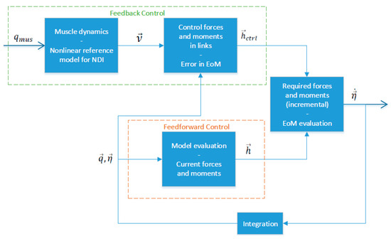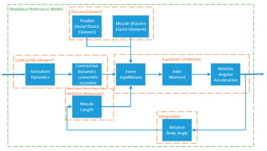 The muscles are modeled using a Hill-type model [12], including tendon, elastic, and contractile element [13,14,15]. Figure 2 illustrates the workflow of the nonlinear reference model, including the muscle model that commands the NDI controller of Section 3.