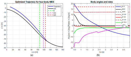Optimized trajectory (a) and body angles and upper body rate over the flight time (b) for four-body MBS on Okurayama hill.