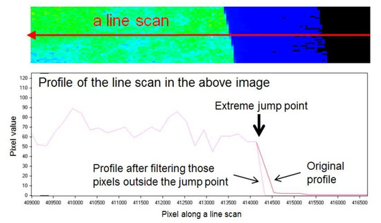The magnitude of border noise varies from scene to scene and for a few cases it is even equivalent to that of the valid data, so a predetermined-threshold masking approach is not feasible. Cropping an image by a certain width of border margin may remove the noise but also cut off good data. Such indiscriminate cropping could result in a no-data gap between two consecutive scenes. Considering also that most of the images received are processed already onto a local map projection instead of in their Level-1 swath format, a method using line-by-line scanning and filtering is proposed. The idea is based on the fact that the noise value is generally far lower than a valid value. The method traces an extreme jump between two neighboring pixels along a scan line and then locates the separation point of noise and valid data. The jump can be expressed as a ratio of values of two neighboring pixels (non-zero), and the maximum ratio represents very likely the extreme jump, as displayed in Figure 3. In practice, there is a condition applied to this maximum ratio, i.e., it should be significantly larger than the second maximum ratio. This is to avoid a false locating of the separation point. Generally, this line-by-line scanning and filtering method works for most cases, but there are still a couple of issues, especially for images dominated by open water and sea ice. First, some open water pixels have a very low backscattering that is almost equivalent to those of the noises (see Figure 4a), and then the maximum ratio may not happen at the real separation point but at the boundary of water and ice. This results in an overshot filtering, as shown in Figure 4b. To prevent it, a second round scanning is introduced, which applies a limit on how deep the scanning can get inside the image. The limit depth comes from an average width of noise belt estimated during the first round scanning. The second issue is that, after scanning horizontally and vertically, the noises are not completely removed in some cases, i.e., there are a few noise residuals. To solve it, two additional scans should be done at tilted directions of 45° and 135°, respectively, to the horizontal.