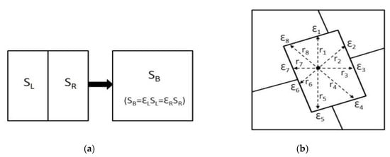 Assuming that two scenes have a common boundary, but the boundary values are SL for the left scene and SR for the right one, a simple way to match the boundary is to multiply SL and SR by the coefficients of εL and εR, respectively, and then make both sides be equal to a balanced value SB, as described in Figure 5a. SB should be thought as a linear or nonlinear combination of SL and SR. If it is assumed that there is no difference between SL and SR regarding data quality (e.g., signal-to-noise ratio level) or other priorities (e.g., incident angle, weather conditions etc.), SB = (SL + SR)/2 could be a good match. Once the balanced formula SB is defined, the coefficients εL and εR could be derived as a function of the boundary values SL and SR. Actually, SL and SR are not values of a single pixel on the boundary but they are obtained by statistically averaging a bundle of nearby pixels that surround each boundary pixel. For a pixel away from any boundary, the balancing could be impacted by all coefficients of all boundaries. To simplify the process but still efficiently maintain an all-direction balancing scheme, an octal-direction boundary matching is applied, as shown in Figure 5b. The balancing coefficient of any pixel is determined by the sum of eight coefficients (ε1, ε2, …, ε8) weighted by their inverse distance (1/r1, 1/r2, …, 1/r1) which is measured from a boundary to that pixel.