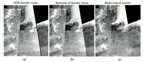 An example of Sentinel-1 mosaic. (a) Mosaic without border noise removal; (b) mosaic after noise removal; (c) mosaic with tone balancing.