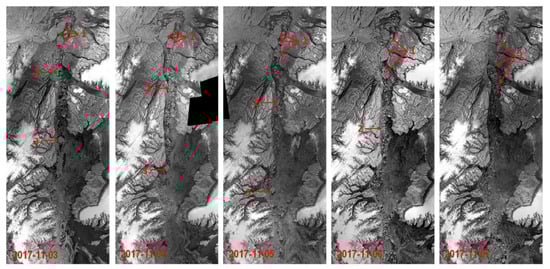 The impacts of border noise and tone difference to a mosaic are displayed in Figure 6a, while the results of noise removal and tone balancing are displayed in Figure 6b,c. It is obvious through comparing the three panels in Figure 6 that the methods developed in Section 2 work very well. The dark seams of border noises in Figure 6a are neatly removed in Figure 6b, and then the tone differences in Figure 6b are smoothly balanced in Figure 6c. One of the advantages of the mosaic product is its capability to display an extended coverage at either regional or global scale. For example, by mosaicking as many as 450 Sentinel-1 A/B scenes observed in four days, a Pan-Arctic view of sea ice can be obtained, as shown in Figure 7. Even though it is comprised of hundreds of scenes, the overall balancing process performs quite favorably, especially for the land and sea ice coverage. However, an issue appears over the open water areas (mainly in the upper-right part), where there are still high-contrast tone differences and non-smooth textures. This complexity is caused by the fact that SAR imaging of open water is very sensitive to the radar incident angle as well as local to weather conditions, such as surface wind speed. Another important application of a short-term mosaic product is to trace the ice drift visually or digitally. Five consecutive daily mosaic images over the Nares Strait are provided in Figure 8. To increase the revisit frequency, both Sentinel-1 A/B and RADARSAT-2 data are collected. Three ice targets (Labeled as 1, 2, and 3 in Figure 8) are identified, image by image, and the downward ice movement is traced.